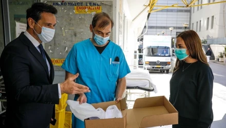Τις μάσκες παρέλαβε ο Ευάγγελος Μπαλής, επικεφαλής της μονάδας COVID-19 του «Ευαγγελισμού», νοσοκομείου αναφοράς για την πανδημία.