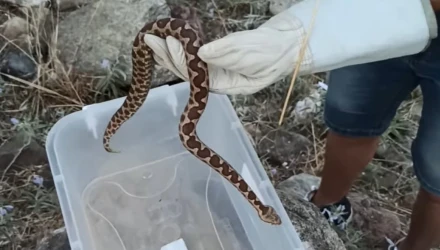 Αυτή τη φορά η κλήση έγινε έγκαιρα, με αποτέλεσμα η οχιά να εντοπιστεί από τον εθελοντή της Δράσης για την Άγρια Ζωή, Στέλιο Γερονυμάκη και να απομακρυνθεί από την περιοχή.