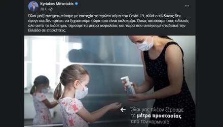 «Όλοι μαζί αντιμετωπίσαμε με επιτυχία το πρώτο κύμα του Covid-19, αλλά ο κίνδυνος δεν έφυγε και δεν πρέπει να ξεχαστούμε τώρα που είναι καλοκαίρι», αναφέρει ο πρωθυπουργός, Κυριάκος Μητσοτάκης, σε μήνυμα του στα μέσα κοινωνικής δικτύωσης για τον κορωνοϊό.