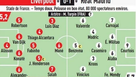 Αν κι η έγκυρη και σοβαρή L’ Equipe, βαθμολόγησε με μο 5,7 τη Ρεάλ και 5,2 τη Λίβερπουλ. Ήτοι, με 0,5 μο υπέρ της Ρεάλ… Αυτή η διαφορά – η οποία θεωρητικά πάει, κόντρα στις εντυπώσεις - στη βαθμολογία της γαλλικής εφημερίδας δεν οφείλεται - πρακτικά - στην ουσία. Στο «εννιάρι» του Βέλγου τερματοφύλακας της «βασίλισσας» οφείλεται….