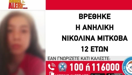 Στις 06/08/2022, πρωινές ώρες, βρέθηκε η Νικολίνα Μίτκοβα 12 ετών, η οποία είχε εξαφανιστεί στις 05/08/2022 από την περιοχή των Αμπελοκήπων Μενεμένης στη Θεσσαλονίκη και είναι καλά στην υγεία της.
