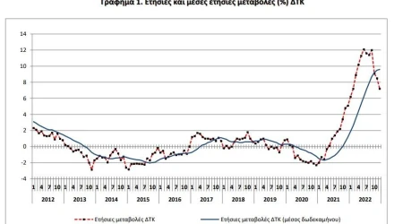 Ο μέσος ΔΤΚ του δωδεκαμήνου Ιανουαρίου 2022 - Δεκεμβρίου 2022, σε σύγκριση με τον αντίστοιχο Δείκτη του δωδεκαμήνου Ιανουαρίου 2021 - Δεκεμβρίου 2021, παρουσίασε αύξηση 9,6% έναντι αύξησης 1,2% που σημειώθηκε κατά την αντίστοιχη σύγκριση του δωδεκαμήνου Ιανουαρίου 2021 - Δεκεμβρίου 2021 με το δωδεκάμηνο Ιανουαρίου 2020 - Δεκεμβρίου 2020.