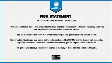 H Γκαζιαντέπ παρά την απόφαση της τουρκικής κυβέρνησης για ακύρωση κάθε αθλητικής δραστηριότητας και το πένθος της χώρας μέχρι τη Δευτέρα (13/2) ζήτησε από τη FIBA να αγωνιστεί κανονικά κόντρα στην Κρέιλσχαϊμ για το Europe Cup!