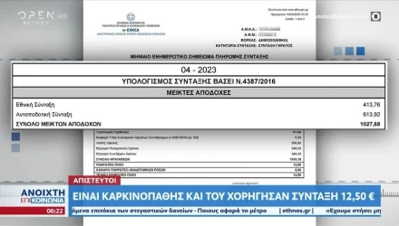 Ένα απίστευτο περιστατικό ανέδειξε το OPEN και η εκπομπή «Ανοιχτή Επικοινωνία». Σύμφωνα με το ρεπορτάζ, ένας καρκινοπαθής λαμβάνει σύνταξη μόλις 12,5 ευρώ τον μήνα, κάτι που επιβεβαιώνεται και από τα επίσημα στοιχεία του ΕΦΚΑ.