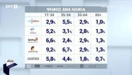 Από εκεί και πέρα, η Νέα Δημοκρατία είχε το μεγαλύτερο ποσοστό στις ηλικίες 65+ καθώς έλαβε το 42,7% των ψήφων, ο ΣΥΡΙΖΑ στους 17-34 (20%), όπως και το ΠΑΣΟΚ (19,5%) αλλά και το ΚΚΕ (9,5%). Η Ελληνική Λύση είχε 4% στις ηλικίες 55-64, η Νίκη 5,5% στους 35-54, ενώ και η Πλεύση Ελευθερίας είχε το μεγαλύτερο ποσοστό της (5,2%) στις νεαρές ηλικίες.ς