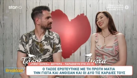 Στο εστιατόριο του First Dates βρέθηκαν ο 30χρονος Τάσος και η συνομίλική του Γιώτα από την Θεσσαλονίκη. Οι δύο παίκτες του ριάλιτι αγάπης του Star άφησαν ανοιχτό το ενδεχόμενο να ξανά βγουν.
