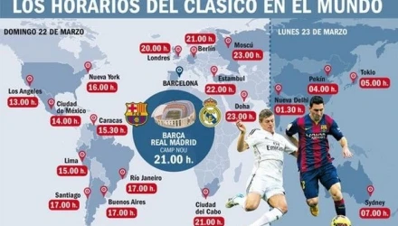 Ολόκληρος ο πλανήτης θα συντονιστεί την Κυριακή (22/3, 22.00) στο Καμπ Νόου για το απόλυτο ντέρμπι του παγκόσμιου ποδοσφαίρου ανάμεσα σε Μπαρτσελόνα και Ρεάλ Μαδρίτης. Η εφημερίδα Sport... καρφίτσωσε πάνω στον χάρτη της Γης την τοπική ώρα που θα ξεκινήσει ο αγώνας σε αρκετές μεγάλεις πόλεις. Από τις 13.00 στο Λος Άντζελες μέχρι τις 7 τα ξημερώματα στο Σίδνεϊ.