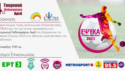 Την Παρασκευή 2 Ιουνίου, στις αθλητικές εγκαταστάσεις του «ΜΑΚΕΔΟΝΙΚΟΥ»,θα πραγματοποιηθεί το 4Ο ΤΟΥΡΝΟΥΑ ΠΟΔΟΣΦΑΙΡΟΥ ΑΤΟΜΩΝ ΜΕ ΑΝΑΠΗΡΙΑ που διοργανώνει η Εταιρεία Ψυχικής Υγείας και Κοινωνικής Αποκατάστασης «ΕΨΥΚΑ» σε συνεργασία με το Κοι.Σ.Π.Ε. «ΙΡΙΣ». ‘Ωρα έναρξης των αγώνων 9:30 π.μ.