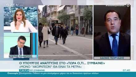 Ο υπουργός Ανάπτυξης Άδωνις Γεωργιάδης αναφερόμενος στα μέτρα προστασίας κατά του κορωνοϊούπου ελήφθησαν και που λαμβάνονται από την κυβέρνηση δήλωσε ότι όσο υπάρχει πανδημία και υπάρχει κίνδυνος θανάτων τα μέτρα θα ακολουθούν τη μέθοδο «ακορντεόν». Ο κ. Γεωργιάδης αναφέρθηκε στη λειτουργία της αγοράς διαφόρων κλάδων αλλά και στα μέτρα στήριξης της κυβέρνησης που ελήφθησαν για τις πληττόμενες επιχειρήσεις.