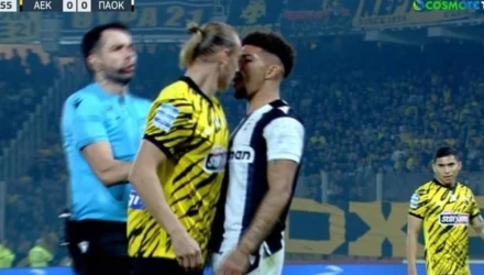 Μια μικρή εστία έντασης σημειώθηκε κατά την διάρκεια του ντέρμπι που βρίσκεται σε εξέλιξη στην Αγία Σοφία μεταξύ ΑΕΚ και ΠΑΟΚ στο 11ο λεπτό της αναμέτρησης όταν Βίντα και Αουγκούστο "αρπάχτηκαν" με αφορμή ένα μαρκάρισμα του Κροάτη στόπερ.