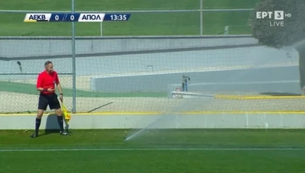 Στο 14ο λεπτό της αναμέτρησς του ΑΕΚ Β'-Απόλλων Σμύρνης άνοιξαν τα ποτιστικά την ώρα του αγώνα.