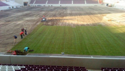 Ήδη από χτες Τρίτη 22/10/2019 η ανάδοχος εταιρεία, με την ολοκλήρωση της τοποθέτησης του χλοοτάπητα πέρασε στην 6 φάση των εργασιών. Η φάση αυτή περιλαμβάνει τη δεύτερη επισπορά του χλοοτάπητα (η πρώτη έγινε στις εγκαταστάσεις της εταιρείας πριν το κόψιμό του και θα ακολουθήσει η 3 μετά τον αγώνα με τη Λαμία), τον ψεκασμό και τη λίπανση του, καθώς και την αμμοδιανομή της επιφάνειας.