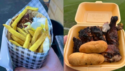 Jerk chicken and rice, jerk pork belly with rice and jerk loaded fries at Bristol Rovers FC (@Official_BRFC @jerkkingbristol)