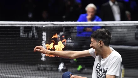 Απίστευτο περιστατικό σημειώθηκε στην O2 Arena κατά τη διάρκεια του αγώνα επίδειξης του Στέφανου Τσιτσιπά με τον Ντιέγκο Σβάρτσμαν για το Laver Cup, με έναν ακτιβιστή να εισβάλλει στο κορτ και να προκαλεί διακοπή, βάζοντας φωτιά στο χέρι του.
