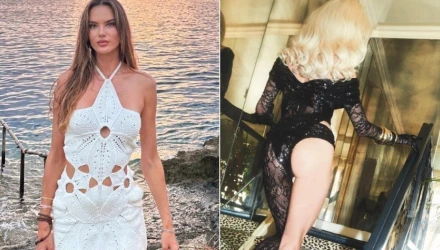 Ποζάροντας στον φακό, η Αμπρόσιο ανεβαίνει τις σκάλες με το ένα πόδι της εντελώς γυμνό από ψηλά στον γοφό. Σε άλλη φωτογραφία, η ίδια φορά λεοπάρ εσώρουχα και μια διάφανη ρόμπα που δημιουργεί ένα μακρύ πέπλο γύρω της.