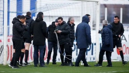 Ο διαιτητής Μανούχος με τους βοηθούς του και τους αρχηγούς του Ατρομήτου και της ΑΕΚ ήλεγξαν το ύψος των δύο εστιών και φαίνεται ότι υπάρχει ασυμμετρία που οδήγησε στην αναβολή της αναμέτρησης.