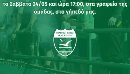Ανοιχτή γενική συνέλευση θα γίνει στην ΑΕ Κρήνης το Σάββατο 24 Μαΐου και ώρα 5μμ στα γραφεία της ομάδας στο γήπεδο.