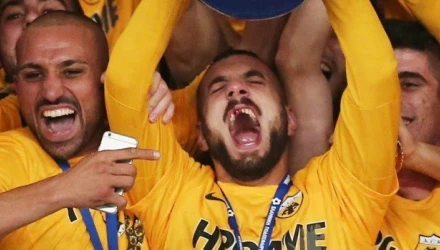 Ο Χρήστος Αραβίδης, ο οποίος έχασε τρία δόντια(!) μετά από μαρκάρισμα με τον Μποτία, παρουσιάστηκε... φαφούτης στους πανηγυρισμούς του τροπαίου.