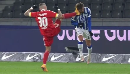 Ο Γερμανός μέσος της Ουνιόν αντί για την μπάλα χτύπησε με τις τάπες στο λαιμό και στο κεφάλι τον Λουκάς Τρουσάρτ της Χέρτα.