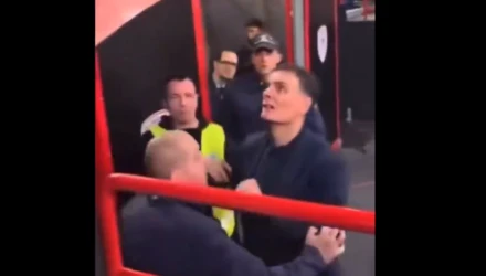 Ο έλληνας τεχνικός σκαρφάλωσε κυριολεκτικά στα κάγκελα του γηπέδου προκειμένου να ζητήσει τον λόγο από τον οπαδό που τον έβριζε.