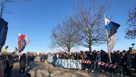 Αψηφώντας τον «συναγερμό» για διαφύλαξη της δημόσιας υγείας, οι φίλοι των «νερατζούρι» συγκεντρώθηκαν στο προπονητικό κέντρο για να τους αποθεώσουν πριν αναχωρήσουν για το Τορίνο.