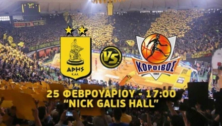 «Η Άρης Κ.Α.Ε. ανακοινώνει ότι από την Τετάρτη 22/02 τίθενται στην κυκλοφορία τα εισιτήρια για τον αγώνα με τον Κόροιβο Αμαλιάδας στο «Nick Galis Hall» (Σάββατο 25/02, 17:00), στο πλαίσιο της 19ης αγωνιστικής της STOIXIMAN.GR Basket League.
