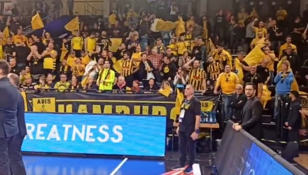 Από την προθέρμανση κιόλας έκαναν έντονη την παρουσία τους, έχοντας γεμίσει την κερκίδα πίσω από τη μία μπασκέτα, ενώ πολλοί βρίσκονται και πίσω από τον πάγκο των κιτρινόμαυρων.