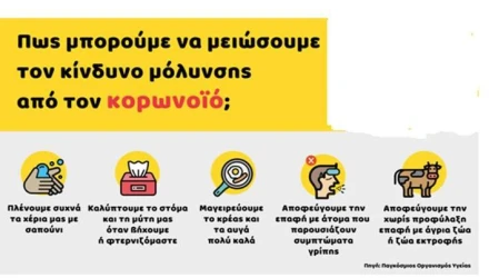 Μεταξύ άλλων το σημείωμα αναφέρει ότι: «Θα πρέπει να πλένουμε συχνά τα χέρια μας, όταν βήχουμε ή φταρνιζόμαστε να καλύπτουμε το στόμα και τη μύτη μας με τον αγκώνα, να αποφεύγουμε τις κοντινές επαφές, αν παρουσιάζουμε συμπτώματα πυρετού, βήχα ή δυσκολίας στην αναπνοή και έχουμε ταξιδιωτικό ιστορικό σε πληττόμενη περιοχή να επικοινωνούμε με τον γιατρό μας ή με τον ΕΟΔΥ και να παραμένουμε στο σπίτι μας. Ακόμη να πλένουμε τα χέρια μας όταν μαγειρεύουμε, όταν φροντίζουμε ασθενείς, όταν ερχόμαστε σε επαφή με ζώα».