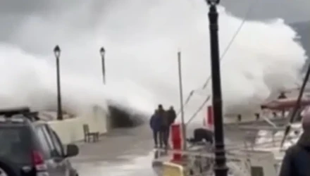 Στα πλάνα φαίνεται ο άνδρας να δένει σκάφος, όταν ένα τεράστιο κύμα ξεπερνά το ύψος του κυματοθραύστη και πέφτει με ορμή πάνω στους πολίτες που βρίσκονταν στο σημείο.