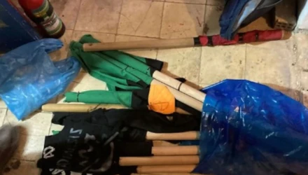 Οι αστυνομικοί βρήκαν, μεταξύ άλλων, κοντάρια και κράνη, τα οποία μαζί με όλα τα ευρήματα θα αποσταλούν στη Διεύθυνση Εγκληματολογικών Ερευνών για εργαστηριακή εξέταση.