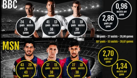 Ο Γκάρεθ Μπέιλ, για παράδειγμα μετρά (20) τους σχεδόν μισούς αγώνες από Λιονέλ Μέσι (38), Νεϊμάρ (38) και Λουίς Σουάρες (43). Μόλις 6 περισσότερους αγώνες από τον Ουαλό συμπαίκτη του έχει ο Γάλος φορ της «εστεμμένης». Με 26 υστερεί κατά πολύ των αντιπάλων του της «Μπάρτσα». Μόνον ο ο Κριστιάνο Ρονάλντο με 38 αγώνες στα πόδια του συγκρίνεται μαζί τους. Κι ο Πορτογάλος με 41 γκολ μόλις -2 πίσω από τον Λουίς Σουάρες. Ο Βραζιλιάνος έχει τα περισσότερα (43) στη σύγκριση της μιας με την άλλη τριπλέτα ενώ έχει και τις περισσότερες ασίστ (20)…