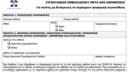 Ουσιαστικά πρόκειται για δύο έντυπα: το ερωτηματολόγιο το οποίο θα συμπληρώνει κάθε πολίτης πριν του χορηγηθεί το εμβόλιο αλλά και ένα έντυπο συναίνεσης "μετά από ενημέρωση για ενήλικες μη δυνάμενους να παράσχουν προφορική συγκατάθεση".