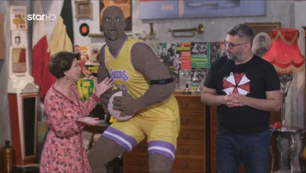 Αφού πρώτα αποκάλυψε ότι στο σπίτι του έχει 4-5 εκατομμύρια τουβλάκια, αφού προηγουμένως εξήγησε στη Δέσποινα Μοιραράκη τα χαρακτηριστικά του αγάλματος του παλαίμαχου σέντερ και πώς αυτό ήρθε στην κατοχή του.