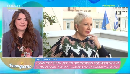 Συνέντευξη στην εκπομπή Buongiorno παραχώρησε η Χριστίνα Κοραή, η οποία μεταξύ άλλων αναφέρθηκε στην απώλεια της αδελφής της.