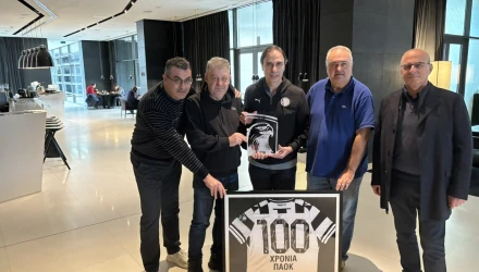 Οι Δημήτρης Μανάρης, Γιώργος Κανταρτζής, Νίκος Συμεωνίδης, Μανώλης Διβανίδης, από το club επισκέφθηκαν τα μέλη της αποστολής του ΟΦΗ και έδωσαν στον Ηλία Πουρσανίδη την πλακέτα και την υπογεγραμμένη φανέλα των παικτών του ΠΑΟΚ