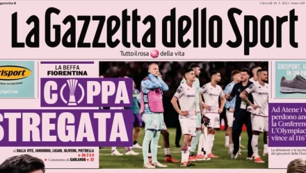 Η Gazzetta dello Sport αναφέρει στο πρωτοσέλιδό της: «Στοιχειωμένο κύπελλο» και σημειώνει: «Η κοροϊδία της Φιορεντίνα. Στην Αθήνα οι Βιόλα έχασαν ξανά το Conference, ο Ολυμπιακός κέρδισε στο 116’».