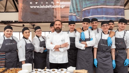 Ο Executive Chef και εκπαιδευτής του ΙΕΚ ΔΕΛΤΑ 360 Ευθύμης Τσακίρης, πλαισιωμένος από τους σπουδαστές του τομέα Γαστρονομίας