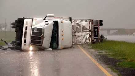Λίγο αργότερα, έξω από το παρμπρίζ του φορτηγού, η ορατότητα περιορίζεται αισθητά. Στη συνέχεια, το φορτηγό απογειώνεται και πέφτει πίσω στο δρόμο. Δυστυχώς για τον οδηγό, οι ριπές αέρα γίνονται εντονότερες και σύντομα το φορτηγό αναποδογυρίζει στο πλάι του. Ευτυχώς, κανείς δεν φαίνεται να έχει τραυματιστεί.