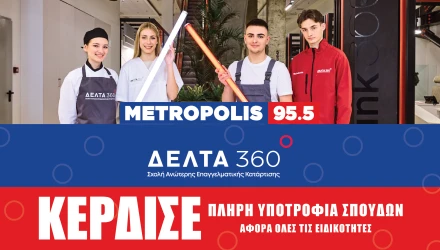 Κέρδισε μία πλήρη υποτροφία στην ειδικότητα που θέλεις! Ο Metropolis 95.5 και οι Ανώτερες Σχολές ΔΕΛΤΑ 360 σου δίνουν τη δυνατότητα να σπουδάσεις αυτό που αγαπάς, κερδίζοντας υποτροφία σπουδών στην ειδικότητα της επιλογής σου – ανάμεσα σε 12 τομείς σπουδών και 100 ειδικότητες!