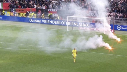 Στη συνέχεια όμως και στο 3-0 των φιλοξενούμενων μια μερίδα οπαδών του Άγιαξ πέταξε καπνογόνα μέσα στον αγωνιστικό χώρο και ορισμένοι εισήλθαν στο χορτάρι, με αποτέλεσμα ο διαιτητής να διακόψει το παιχνίδι.