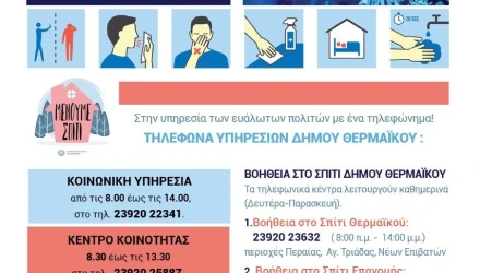 Οι κάτοικοι του Δήμου που ανήκουν στις ευαίσθητες κοινωνικές ομάδες (ηλικιωμένα άτομα χωρίς υποστηρικτικό περιβάλλον, ΑμΕΑ κλπ) και δε μπορούν να μετακινηθούν ή αδυνατούν να αυτοεξυπηρετηθούν, μπορούν να επικοινωνούν τις εργάσιμες ημέρες και ώρες, 08:30 - 13:30, στις τηλεφωνικές γραμμές υποστήριξης πολιτών 23920 24010 και 23920 24356.