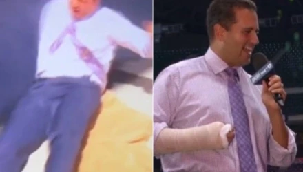 Δεν... πήγε και πολύ καλά αυτό, θα μπορούσε να πει κάποιος βλέποντας έναν ρεπόρτερ του μπέιζμπολ να κάνει τσουλήθρα στον «αέρα» και να καταλήγει με σπασμένο χέρι και ραγισμένα πλευρά.