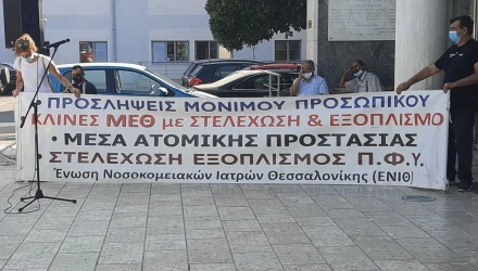 Στις 13:00, μέλη της Ένωσης Νοσοκομειακών Ιατρών Θεσσαλονίκης θα συγκεντρωθούν στην 3η και 4η υγειονομική περιφέρεια στην οδό Αριστοτέλους. Οι νοσοκομειακοί καταγγέλλουν τεράστιες ελλείψεις προσωπικού και υποδομών στη δημόσια περίθαλψη.
