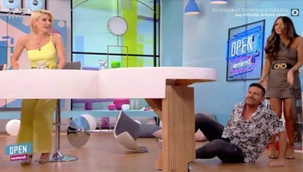 Επικό ατύχημα σημειώθηκε στην εκπομπή «Open Weekend» , αφού η Ελένη Τσολάκη έριξε κατά λάθος στο έδαφος τον συνεργάτη της Δημήτρη Μηλιόγλου.