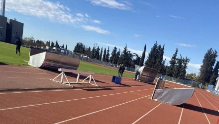 Οι φιλοξενούμενοι πηγαίνοντας στο γήπεδο αντίκρυσαν τους πάγκους να μην είναι στη θέση τους λόγω του δυνατού αέρα.