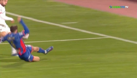 Στο 52ο λεπτό της αναμέτρησης, ο Ράφα Σοάρες επιχείρησε να βγάλει μια σέντρα από τ' αριστερά, με τον Καλογερόπουλο να σταματά την πορεία της μπάλας ξεκάθαρα με το χέρι. Ο ρέφερι στον αγωνιστικό χώρο, Δημήτρης Μαλούτας, δεν αντιλήφθηκε την ξεκάθαρη παράβαση, ωστόσο, η ευθύνη βαραίνει πρωτίστως τον VAR, Βεργέτη, που δεν «διόρθωσε» το λάθος αλλά δεν κάλεσε ούτε τον διαιτητή του για έλεγχο της επίμαχης φάσης.