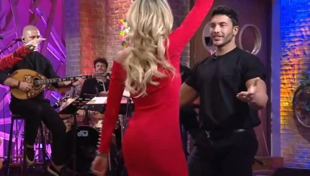 Η ίδια ξεκίνησε να χορεύει με τον Γιώργο Ασημακόπουλο και άναψε φωτιές τόσο με τις χορευτικές της φιγούρες όσο και με το κατακόκκινο φόρεμά της, που τράβηξε τα βλέμματα.