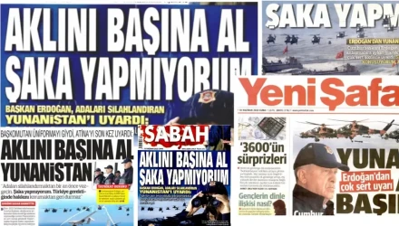 H εφημερίδα Sabah αναφέρει πως: «Ο Πρόεδρος Ερντογάν προειδοποίησε την Ελλάδα που εξοπλίζει τα νησιά : Συμμαζέψου και μείνε μακριά από όνειρα που όπως ακριβώς έγινε πριν από ένα αιώνα, θα καταλήξεις μετανιώσεις για αυτά» επισημαίνοντας στον τίτλο: «Βάλε μυαλό δεν κάνω πλάκα».