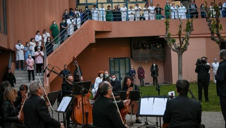 Λίγες νότες χαράς και αισιοδοξίας έδωσαν σήμερα το απόγευμα (Πέμπτη 23 Απριλίου 2020) τα Μουσικά Σύνολα της ΕΡΤ, σε μια συναυλία για τους γιατρούς, τους νοσηλευτές και τους ασθενείς του νοσοκομείου «Αττικόν».