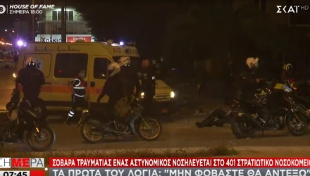 Στο 401 Στρατιωτικό νοσοκομείο νοσηλεύεται, χωρίς να κινδυνεύει η ζωή του, ο 27χρονος αστυνομικός που τραυματίστηκε σοβαρά κατά τη διάρκεια των επεισοδίων στη Νέα Σμύρνη το απόγευμα της Τρίτης. Ο αστυνομικός της ομάδας Δράση φέρει μώλωπες και κακώσεις σε όλο του το σώμα, ενώ και η αξονική τομογραφία στην οποία υπεβλήθη ήταν καθαρή.